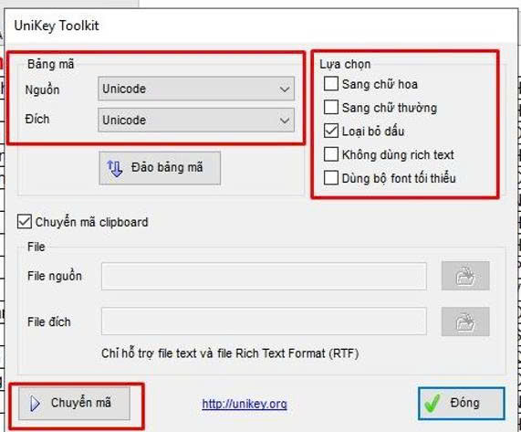 Khi cửa sổ hiện ra, ở phần bảng mã bạn chọn nguồn và đích thuộc bảng mã đã xác định ở trên là Unicode.