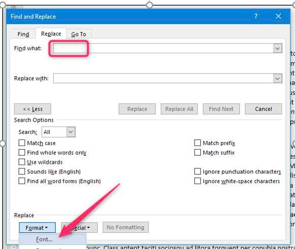 Trên tab Replace, nhấp chuột vào ô Find What để xác định tìm chữ trong Word, sau đó nhấn vào mũi tên xổ xuống trong mục Format.