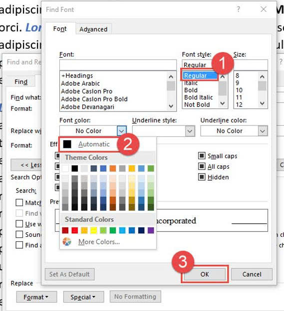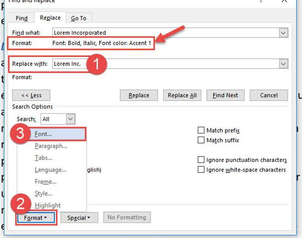 Trong hộp Replace With bạn nhập Lorem Inc và bấm nút Format chọn Font để áp dụng Replace trong Word.