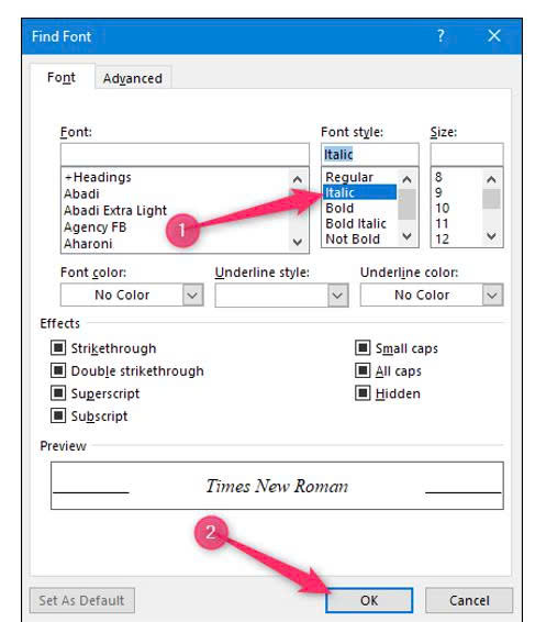 Trong cửa sổ Find Font tìm chữ trong Word, chọn loại định dạng mà bạn muốn tìm kiếm (trong ví dụ này là in nghiêng-Italic) sau đó bấm nút OK.