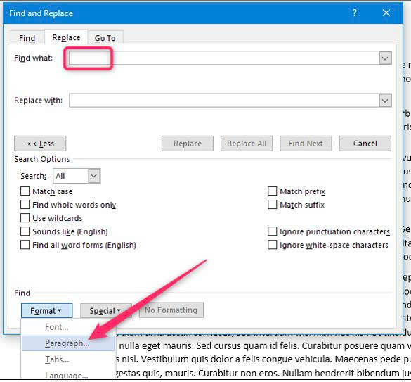 Trong hộp Find What xuất hiện, bạn nhấp chuột vào điểm chèn và chọn Format > Paragraph.