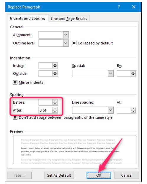 Trong hộp Replace With bạn chọn Format > Paragraph. Trong cửa sổ Replace Paragraph tại mục Before để khoảng cách trước là 0 và 8pt với khoảng cách sau tại mục After. Sau đó bấm nút OK.