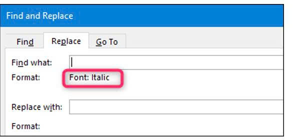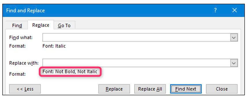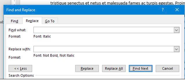 Giả sử bạn muốn loại bỏ các văn bản được in nghiêng, bạn có thể làm được điều này với thao tác tìm kiếm và thay thế nâng cao trong Word, cụ thể với các bước lần lượt như sau: