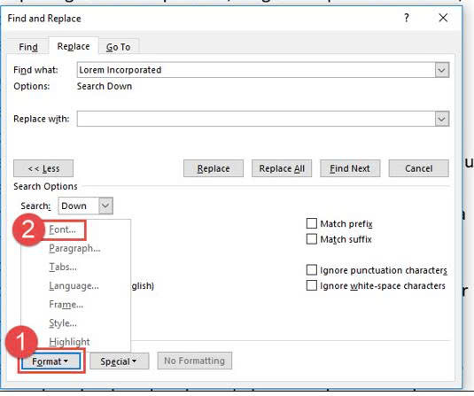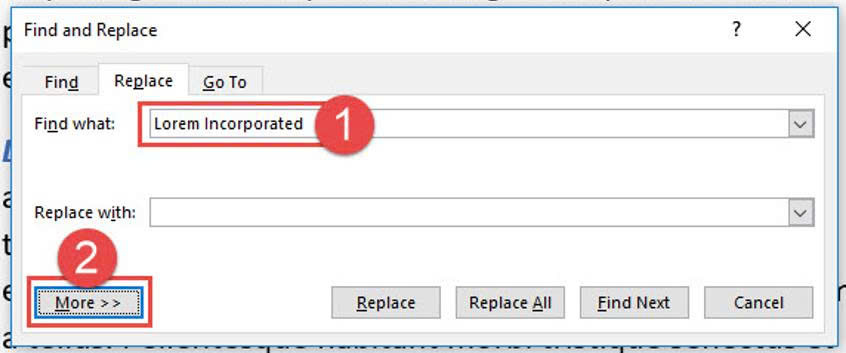 Nhập Lorem Incorporated vào hộp Find What.