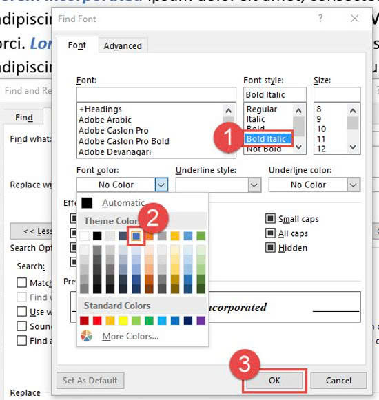 Trong cửa sổ Find Font tìm chữ trong Word bạn chọn tùy chọn Bold Italic (in đậm và in nghiêng) tại khung Font style, trong menu thả xuống của mục Font Color chọn màu xanh dương và bấm nút OK.
